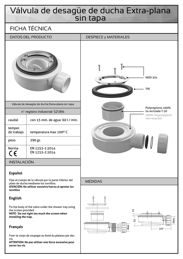 Diseñada y adaptable a cualquier tipo de plato de ducha de pizarra o resina cuya salida tenga un diámetro de 40mm